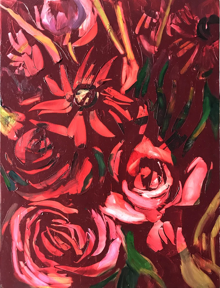Cara has a contemporary vision of florals that is vibrant, bold and alive. The goal of this series was to explore floral compositions in a way that highlights their textures, forms and colors with a raw expression of the energy, dynamism, and the life that they possess. The artist’s vigorous, decisive brushstrokes and her intricate compositions elicit a sense of motion and whimsy while her sophisticated color schemes evoke emotion and intrigue. Cara constructs the floral forms with thick slabs of paint, but ultimately, she allows the subject to fracture and unravel almost as if the realism dissolves into an expressive floral explosion.